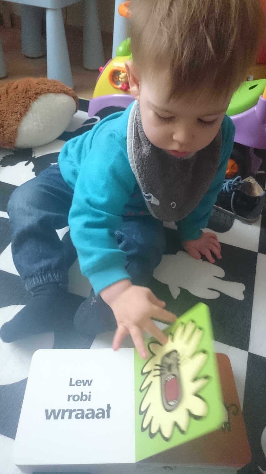 Na koniec chciałam wam zaprezentować książeczki, którymi młody bawi się aktualnie. Część z nich ma od wielu miesięcy (np.opisane już wcześniej kolory), część kupiliśmy, gdy miał około 9 miesięcy. Książki stoja na półce, także w każdej chwili ma do nich dostęp. Zwykle kilka razy dziennie je ściąga i albo ogląda sam, albo przynosi je mnie i oglądamy je razem. Wówczas pokazuje obrazki, a ja mówię mu co to jest, lub jakie dźwięki wydaje to zwierzę czy przedmiot.
